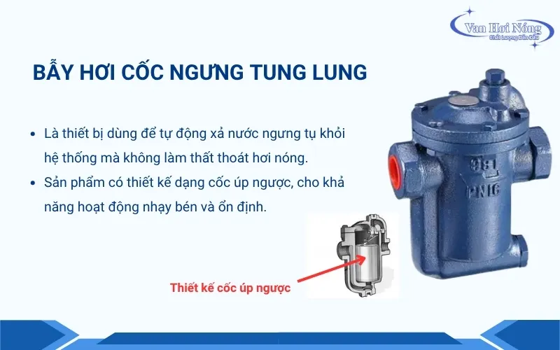 Bẫy hơi dạng cốc ngưng Tunglung hay còn gọi là bẫy hơi gầu đảo TungLung là thiết bị dùng để tự động xả nước ngưng khỏi hệ thống hơi mà không làm thất thoát hơi nóng. Sở dĩ gọi là bẫy hơi cốc ngưng bởi vì sản phẩm có thiết kế dạng cốc úp ngược, cho khả năng hoạt động nhạy bén và ổn định.