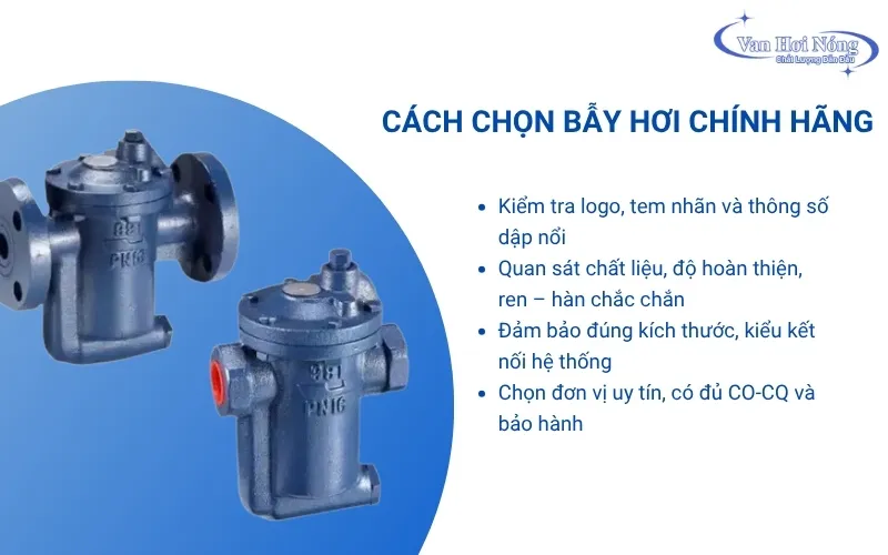 - Thứ ba, kiểm tra thông số kỹ thuật được in dập nổi trên thân, đảm bảo phù hợp áp suất, nhiệt độ cũng như lưu lượng nước ngưng mà hệ thống yêu cầu. Các sản phẩm nhái thường không có thông tin này.