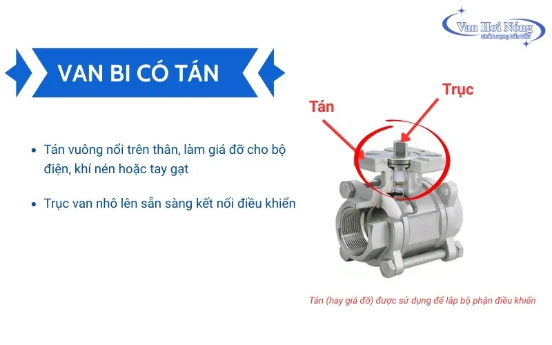 Van bi có tán (tiếng Anh: Ball valve with mounting pad) là loại van bi được thiết kế đặc biệt với phần giá đỡ (mounting pad) ở trên thân van. Thiết kế này có nhiệm vụ làm khung nâng đỡ và giúp kết nối các bộ phận điều khiển khác nhau cho van bi (tay gạt, tay quay, bộ điều khiển điện hoặc bộ điều khiển khí nén). Nhờ vậy, các dòng van bi có giá đỡ rất linh hoạt trong việc kết hợp các kiểu điều khiển.