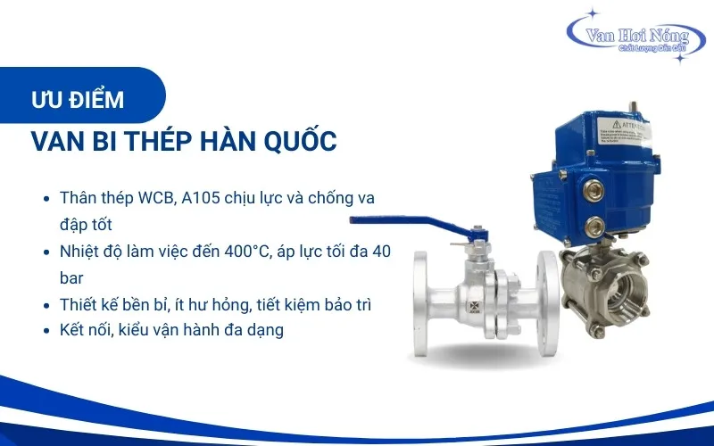 So với van bi gang hoặc van bi nhựa, van bi thép Hàn Quốc có khả năng chịu nhiệt và áp lực cao lên đến hơn 400 độ C, PN16-PN40, phù hợp với các hệ thống hơi nóng, dầu tải nhiệt, khí nén công nghiệp,…