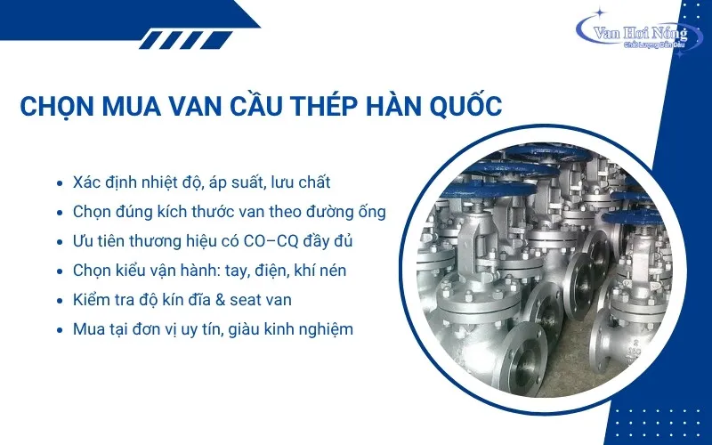Chọn đúng van cầu thép Hàn Quốc không chỉ giúp hệ thống vận hành ổn định mà còn giảm đáng kể chi phí sửa chữa, thay thế về lâu dài. Dưới đây là những kinh nghiệm thực tế mà nhiều kỹ sư thường áp dụng khi chọn mua:
