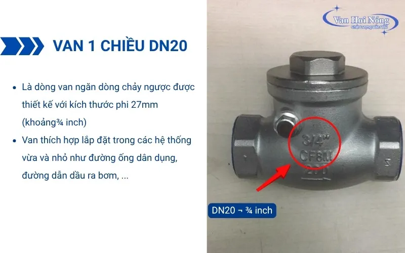 Van một chiều DN20 là loại van cho phép dòng lưu chất đi theo một chiều nhất định và tự động đóng lại khi dòng chảy đảo chiều. Van được thiết kế với kích thước DN20, đương đương phi 27mm (¾ inch) phù hợp cho hệ thống vừa và nhỏ như các đường ống dân dụng, dầu ra bơm, đường cấp hơi,…