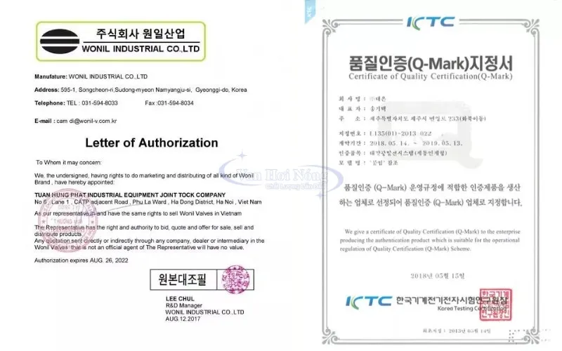 - Thứ ba, van Wonil đạt nhiều chứng nhận quốc tế như ISO 9001, KS, JIS và KGS, khẳng định chất lượng và độ an toàn đạt chuẩn toàn cầu.
